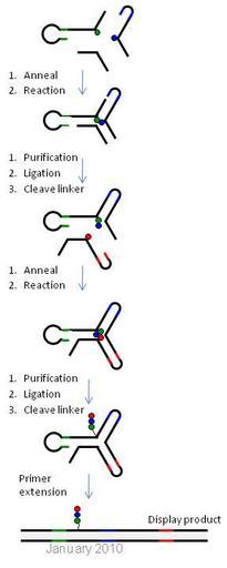 | Keywords: Yoctoreactor library assembly wiki1.JPG  en Figure 2 Stepwise assembly of a DEL library using YoctoReactor technology A 3-way reactor is shown here a Position 1 P1 and P2 BB are brought into close proximity and undergo a chemical reaction in the presence of a helper oligonucleotide in P3 b The structure is purified by polyacrylamide gel electrophoresis PAGE the P1 and P2 DNA is ligated and the P2 linker is cleaved c P3 BB is annealed to the P1-P2 ligation product from step b and a chemical reaction between P2 and P3 BBs takes place d The reaction product is purified by PAGE the DNA is ligated and P3 linker is cleaved yielding a compound OOO covalently attached to the folded yR e The yR is dismantled by primer extension yielding a double-stranded disply product exposing the reaction product for selection and molecular evolution own Viptrh 2010-05-21 Biochemistry |