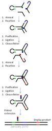 | Keywords: Yoctoreactor library assembly wiki2.TIF en Figure 2 Stepwise assembly of a DEL library using YoctoReactor technology A 3-way reactor is shown here a Position 1 P1 and P2 BB are brought into close proximity and undergo a chemical reaction in the presence of a helper oligonucleotide in P3 b The structure is purified by polyacrylamide gel electrophoresis PAGE the P1 and P2 DNA is ligated and the P2 linker is cleaved c P3 BB is annealed to the P1-P2 ligation product from step b and a chemical reaction between P2 and P3 BBs takes place d The reaction product is purified by PAGE the DNA is ligated and P3 linker is cleaved yielding a compound OOO covalently attached to the folded yR e The yR is dismantled by primer extension yielding a double-stranded disply product exposing the reaction product for selection and molecular evolution own Viptrh 2010-05-21 Biochemistry |