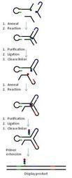 | Keywords: Yoctoreactor library assembly wiki3.JPG en Figure 6 Stepwise assembly of a DEL library using YoctoReactor technology A 3-way reactor is shown here a Position 1 P1 and P2 BB are brought into close proximity and undergo a chemical reaction in the presence of a helper oligonucleotide in P3 b The structure is purified by polyacrylamide gel electrophoresis PAGE the P1 and P2 DNA is ligated and the P2 linker is cleaved c P3 BB is annealed to the P1-P2 ligation product from step b and a chemical reaction between P2 and P3 BBs takes place d The reaction product is purified by PAGE the DNA is ligated and P3 linker is cleaved yielding a compound OOO covalently attached to the folded yR e The yR is dismantled by primer extension yielding a double-stranded disply product exposing the reaction product for selection and molecular evolution own Viptrh 2010-05-21 Biochemistry |