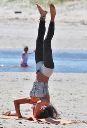 Keywords: yoga woman beach relaxation sand sporty beautiful