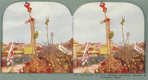 | Keywords: YokohamaFireBrigadeAtheletics.jpg Exhibition of Fire Brigade Atheletics Streets of Yokohama Japan Scanned from period stereo view c 1900 Text on reverse EXHIBITION OF FIRE BRIGADE ATHLETICS YOKOHAMA JAPAN Fires were formerly so common in Japan's wood and paper cities that the nickname of Yeddo Blossom was applied to the flames which in winter almost nightly lit up the metropolis with lurid splendor So completely did this destructive agency establish itself as a national scourge that a whole vocabulary grew up to express every shade of meaning in matters firey The Japanses language has special terms for an incendiary fire tsuke bi and accidental fire soso bi fire starting in one's own house jikwa a fire caught from next door morai bi a fire shared with others raisho anything that may cause a fire as a brazier hinomoto a visit of condolence after a fire kwaji-mimai and so on Oooka the Japanese Solomon mayor and judge of Tokyo early in the 18th century organized the first fire brigade in Japan Since his time fire engines of European make have been brought into use The number of conflagrations has been much diminished of late by the general introduction of stone and brick buildings and wider streets On Jan 4th the firemen parade the streets with their tall light ladders and give a gymnastic performance Public domain No listing of publisher date nor assertion of any copyright Unknown if first publication was in Japan or the USA; one of these tags apply PD-US -or- PD-Japan-oldphoto Acrobatics in art History of firefighting in Japan Stereo cards of Yokohama |