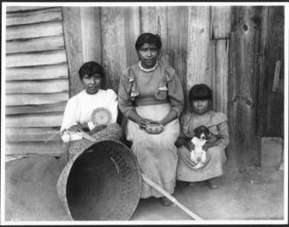 Photograph of a Yokut Indian women basket maker and two girls, Tule River Reservation near Porterville, California, ca.1900. She is sitting, at center with a small basket on her lap. The girls sit on either side of her -- at left holding a small basket with a large conical basket laying on the ground in front, and at right with a small puppy sitting on her lap. All three wear dresses. They sit in front of the rough wooden wall of a building.