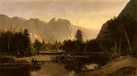 | Keywords: Yosemite Valley by William Keith, 1875.jpg Artwork 1875 Oil on canvas cm 102 9 184 15 Institution Los Angeles County Museum of Art Los Angeles CA accession number object history credit line In the autumn of 1872 Keith made the acquaintance of John Muir when he explored the hills beyond Yosemite with the naturalist Yosemite Valley was a product of a later trip in 1875 A dramatic composed image it was painted in the artist ™s studio specifically as an exhibition piece It portrays a commanding view of Cathedral Rocks which are in the valley along a bend in the Merced River Nothing obstructs the panoramic view A bit of the river bank is included as a repoussoir to lead the viewer into the scene The towering trees are arranged on the sides to permit an open vista of the cliffs The addition of the riders while suggesting a narrative was also essential to the composition Even the pile of dead tree trunks in the center of the painting was arranged so that the large logs would link the two sides of the painting Keith created many such epic paintings during the period between his two European trips and many of these were criticized as too artificial Although the general appearance of this version might give the impression of a standard picturesque composition Keith avoided the tight linear painting style associated with the Düsseldorf school He also escaped the pervasive grays of such German landscapes by infusing the background of Yosemite Valley with an array of soft opalescent hues Los Angeles County Museum of Art http //collectionsonline lacma org/mwebcgi/mweb exe request record;id 32023;type 101 PD-old-100 Paintings of Yosemite William Keith 1875 oil on canvas paintings in the United States Landscape paintings of the United States California Oil paintings of landscapes California Realist landscape paintings Yosemite Valley 1875 Merced River Cliffs in art California in the 1870s 1870s landscape paintings |