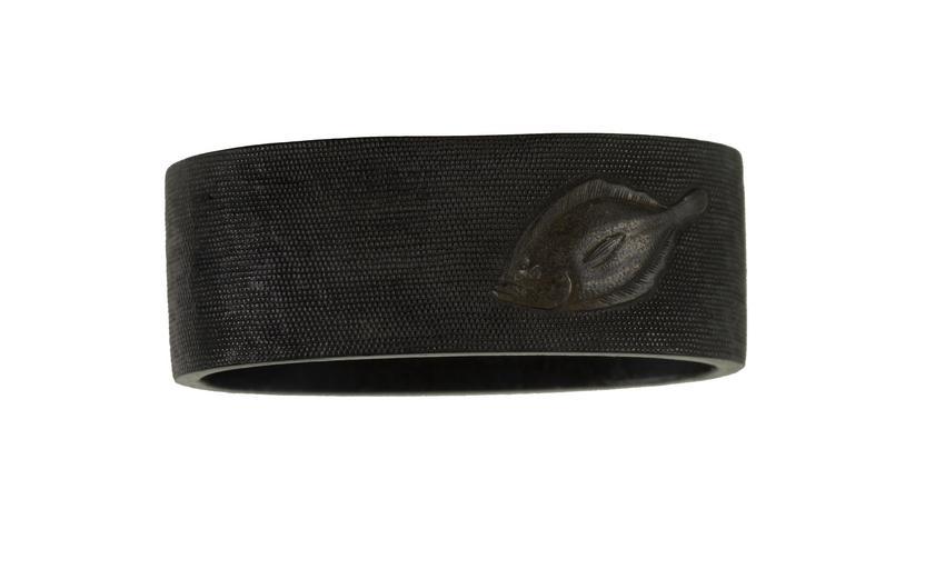 Keywords: Yoshitsugu - Fuchi with Fish and Bamboo - Walters 511124 - Back.jpg A big eyed snapper is shown lying on gold bamboo on the front with a founder on the reverse The fish are displayed as food not as living animals This is part of a set with Walters 51 1125 century 18 Edo shakudo gold cm 3 7 accession number 51 1124 34787 William T / Henry Walters Collection Baltimore date and mode of acquisition unknown Walters Art Museum Henry Walters Acquired by William T or Henry Walters Signature Yoshitsugu kao ; Number In pencil 792 place of origin Japan Walters Art Museum license Tosogu Japanese sword fittings in the Walters Art Museum Media contributed by the Walters Art Museum needs category review Yoshitsugu |