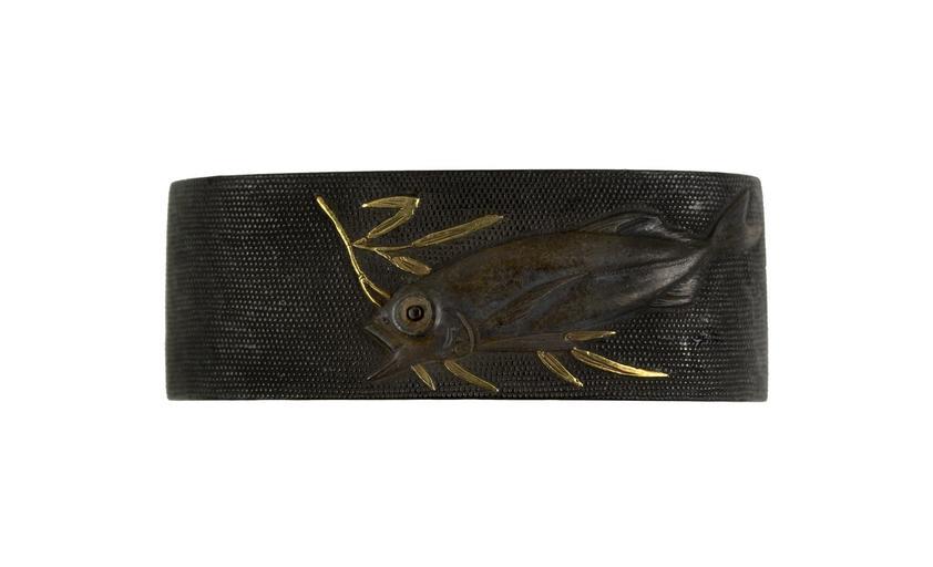 Keywords: Yoshitsugu - Fuchi with Fish and Bamboo - Walters 511124.jpg A big eyed snapper is shown lying on gold bamboo on the front with a founder on the reverse The fish are displayed as food not as living animals This is part of a set with Walters 51 1125 century 18 Edo shakudo gold cm 3 7 accession number 51 1124 34787 William T / Henry Walters Collection Baltimore date and mode of acquisition unknown Walters Art Museum Henry Walters Acquired by William T or Henry Walters Signature Yoshitsugu kao ; Number In pencil 792 place of origin Japan Walters Art Museum license Tosogu Japanese sword fittings in the Walters Art Museum Media contributed by the Walters Art Museum needs category review Yoshitsugu |