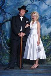 Keywords: young couple portrait posing old fashioned marilyn monroe style cane man woman white dress costume elegant