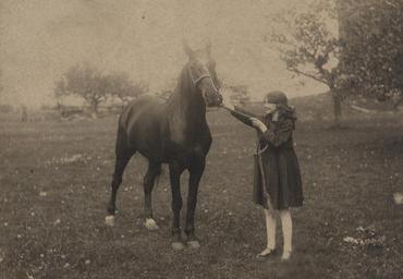 | Keywords: horses women animal outdoor monochrome Photographer: Reuben R. Sallows (1855 - 1937) Description: Young girl stands, facing left, holding lead of a horse. Girl wears knee-length dark dress, white tights, black shoes; long hair tied back with large bow. Horse has white blaze and markings at rear hooves. Tree at right of frame and in upper left quadrant. Sallow imprint in lower right corner of matte. Object ID : 0477-rrs-ogohc-ph View additional photographs by Sallows that are held in other collections at the Reuben R. Sallows Digital Library. Order a higher-quality version of this item by contacting the Huron County Museum (fee applies). Photographer: Reuben R. Sallows (1855 - 1937) Description: Young girl stands, facing left, holding lead of a horse. Girl wears knee-length dark dress, white tights, black shoes; long hair tied back with large bow. Horse has white blaze and markings at rear hooves. Tree at right of frame and in upper left quadrant. Sallow imprint in lower right corner of matte. Object ID : 0477-rrs-ogohc-ph View additional photographs by Sallows that are held in other collections at the Reuben R. Sallows Digital Library. Order a higher-quality version of this item by contacting the Huron County Museum (fee applies). |
