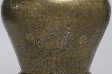 | Keywords: Yunus ibn Yusuf, "al-naqqash al-Mawsili" - Ewer - Walters 54456 - Detail E.jpg In a notable artistic innovation medieval Islamic artisans used precious metals- gold silver and copper- to decorate bronze and brass objects The richly decorated surface of this ewer features multiple bands of Arabic inscriptions and scalloped medallions enclosing musicians enthroned figures hunters and other scenes characteristic of medieval Islamic art The presence of the artist's signature here is noteworthy since the medieval Islamic artisan generally remained anonymous Yunus ibn Yusuf styles himself al-naqqash or decorator probably signifying that he was responsible for executing the inlaid designs He also ends his name al-Mawsili meaning from Mosul a famous metalworking center in northern Iraq However Yunus ibn Yusuf could just as easily have been working in Syria where metal workshops produced similar inlaid vessels during the 13th century between 1246 1247 AH 644 Crusader brass with silver inlay cm 44 5 31 8 16 5 accession number 54 456 22888 Dikran Kelekian New York and Paris Henry Walters city Baltimore Walters Art Museum Henry Walters Acquired by Henry Walters 1917 Signature Yunus ibn Yusuf al-naqqash al Mawsili; Date A H 644; Translation Glory to our lord the sultan the royal Exhibition of Persian Art Iranian Institute New York 1940 Highlights from the Collection The Walters Art Gallery Baltimore 1998-2001 place of origin Mosul Iraq Walters Art Museum license Islamic metalwork in the Walters Art Museum Media contributed by the Walters Art Museum needs category review Yunus ibn Yusuf Brass vessels containers |