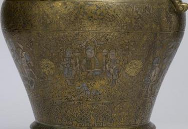 | Keywords: Yunus ibn Yusuf, "al-naqqash al-Mawsili" - Ewer - Walters 54456 - Detail J.jpg In a notable artistic innovation medieval Islamic artisans used precious metals- gold silver and copper- to decorate bronze and brass objects The richly decorated surface of this ewer features multiple bands of Arabic inscriptions and scalloped medallions enclosing musicians enthroned figures hunters and other scenes characteristic of medieval Islamic art The presence of the artist's signature here is noteworthy since the medieval Islamic artisan generally remained anonymous Yunus ibn Yusuf styles himself al-naqqash or decorator probably signifying that he was responsible for executing the inlaid designs He also ends his name al-Mawsili meaning from Mosul a famous metalworking center in northern Iraq However Yunus ibn Yusuf could just as easily have been working in Syria where metal workshops produced similar inlaid vessels during the 13th century between 1246 1247 AH 644 Crusader brass with silver inlay cm 44 5 31 8 16 5 accession number 54 456 22888 Dikran Kelekian New York and Paris Henry Walters city Baltimore Walters Art Museum Henry Walters Acquired by Henry Walters 1917 Signature Yunus ibn Yusuf al-naqqash al Mawsili; Date A H 644; Translation Glory to our lord the sultan the royal Exhibition of Persian Art Iranian Institute New York 1940 Highlights from the Collection The Walters Art Gallery Baltimore 1998-2001 place of origin Mosul Iraq Walters Art Museum license Islamic metalwork in the Walters Art Museum Yunus ibn Yusuf Media contributed by the Walters Art Museum needs category review Brass vessels containers |