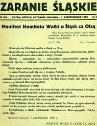 | Keywords: Zaranie Śląskie.jpg en October 1st 1938 issue of Zaranie Śląskie Silesian Dawn containing a manifesto of Komitet Walki o Śląsk za Olzą Committee for Fight for Silesia beyond the Olza River which was an organisation striving to unite Zaolzie with Poland In the manifesto the KWoŚzaO announced the victorious end of the 20 year fight for incorporation of Zaolzie into Poland Zaranie Śląskie of October 1st 1938 Zaranie Śląskie 1938-10-01 PD-Art Czechoslovak-Polish dispute over Cieszyn Silesia Propaganda of Poland Anti-Czech propaganda |