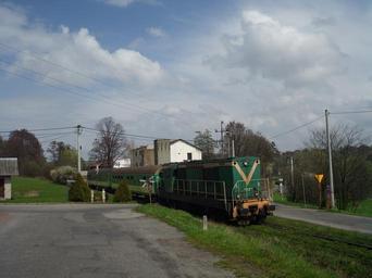 Keywords: Zawada Szybowa tourist train.JPG route 192 Pszów - Syrinia crossing ul Szybowa in Zawada a suburb of Wodzisław Śląski 2012-04-21 own Jan Pešula cc-zero Uploaded with UploadWizard Wodzisław Śląski Railway line 192 Poland SM31 of PKP Cargo