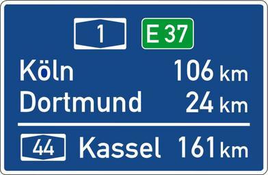 | Keywords: Zeichen 453.svg Zeichen 453 “ Entfernungstafel Sign No 453 “ destinations and distances Image taken from the de Straßenverkehrsordnung German Road Regulations as published by the de Bundesministerium für Verkehr Bau- und Wohnungswesen German Federal Ministry of Traffic Building and Housing at http //www bmvbw de/Verkehr/Strasse- 1449/Strassenverkehrs-Ordnung htm own Andreas06 01 August 2006 Hochladedatum <gallery> File Zeichen 453 - Autobahn - Entfernungstafel StVO 1970 svg </gallery> PD-GermanGov Cc-zero PD-VzKat Bundesautobahn 1 Entfernungstafel Bundesautobahn 44 Entfernungstafel E37 Diagrams of direction road signs of Germany 453 svg Diagrams of direction road signs of Germany 1992 set 453 svg Diagrams of motorway road signs of Germany Entfernungstafel |
