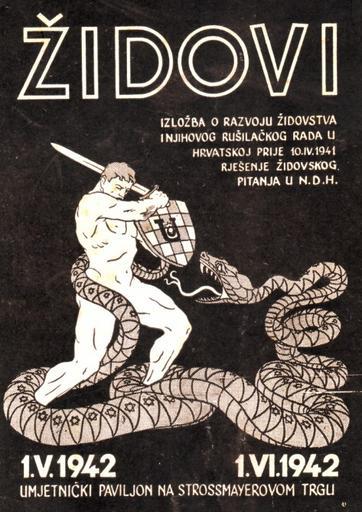 | Keywords: Židovi izložba ndh 1942.jpg  hr Plakat kojim se najavljuje antisemitska izložba u NDH održana od 1 svibnja do 1 lipnja 1942 en World War II poster announcing an antisemitic exhibition in Zagreb held from 1 May to 1 June 1942 in the Art Pavilion The poster reads Jews - Exhibition about the development of Jewry and their destructive work in Croatia prior to 10 April 1941 - solving the Jewish question in the Independent State of Croatia 2012-11-29 20 22 53 http //www serbianna com/columns/savich/084 shtml Serbianna State Propaganda Office Independent State of Croatia 1941-1945 Custom license marker 2012 11 30 PD-Croatia Anonymous-EU Uploaded with UploadWizard Propaganda posters of Independent State of Croatia Antisemitic pictures People with snakes in art |