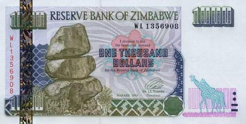 | Keywords: Zimbabwe $1000 12b 2003 Obverse.jpg This is the obverse of a paper banknote of the Zimbabwe Dollar PD-ZW-currency original upload log page en wikipedia Zimbabwe_ 241000_12b_2003_Obverse jpg 2008-10-29 13 51 Mangwanani 550×286× 31344 bytes <nowiki> Summary This is an image of the front of the paper Zimbabwe dollar which circulated from 2001 and 2004 Use of this image in article Banknotes of the Reserve Bank of Zimbabwe is believed to be fair use because It adds </nowiki> Banknotes of Zimbabwe 1994-2003 Giraffes on banknotes Banknotes with a face value of 1000 Blue banknotes of Zimbabwe |