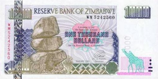 | Keywords: Zimbabwe $1000 2003 Obverse.jpg This is the obverse of a paper banknote of the Zimbabwe Dollar en wikipedia 2008-10-29 Mangwanani wikipedia en PD-ZW-currency original upload log page en wikipedia Zimbabwe_ 241000_2003_Obverse jpg 2008-10-29 13 51 Mangwanani 550×284× 30521 bytes <nowiki> Summary This is an image of the front of the paper Zimbabwe dollar which circulated from 2001 and 2004 Use of this image in article Banknotes of the Reserve Bank of Zimbabwe is believed to be fair use because It adds </nowiki> Banknotes of Zimbabwe 1994-2003 Banknotes with a face value of 1000 Giraffes on banknotes Blue banknotes of Zimbabwe |