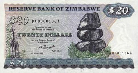 | Keywords: Zimbabwe $20 1980 Obverse.jpg This is an image of the front of the paper Zimbabwe dollar which circulated from 1980 and 1982 en wikipedia 2008-10-02 Mangwanani wikipedia en PD-ZW-currency original upload log page en wikipedia Zimbabwe_ 2420_1980_Obverse jpg 2008-10-02 16 16 Mangwanani 550×294× 36853 bytes <nowiki> Summary This is an image of the front of the paper Zimbabwe dollar which circulated from 1980 and 1982 Use of this image in article Banknotes of the Reserve Bank of Zimbabwe is believed to be fair use because It adds </nowiki> Banknotes of Zimbabwe 1980-1994 Giraffes on banknotes Banknotes with a face value of 20 Grey banknotes of Zimbabwe |
