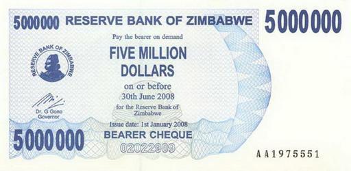 | Keywords: Zimbabwe $5m 2008 Obverse.jpg This is the obverse of a paper banknote of the Zimbabwe Dollar PD-ZW-currency original upload log page en wikipedia Zimbabwe_ 245m_2008_Obverse jpg 2008-10-12 17 53 Mangwanani 550×277× 26077 bytes <nowiki> Summary This is an image of the front of the paper Zimbabwe dollar which circulated from 2007 and 2008 Use of this image in article Banknotes of the Reserve Bank of Zimbabwe is believed to be fair use because It adds </nowiki> Banknotes of Zimbabwe 2006-2008 Banknotes with a face value of 5000000 Blue banknotes of Zimbabwe 2008 banknotes |