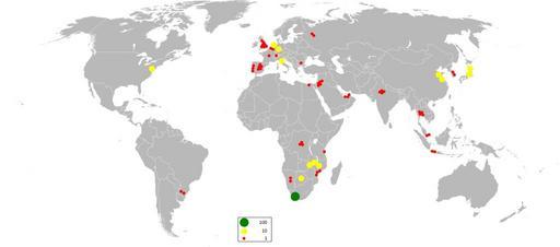| Keywords: Zimbabwean Exports 2006.svg en Distribution of Zimbabwean exports in 2006<br /><br />This bubble map shows the global distribution of Zimbabwean exports in 2006 as a percentage of the top market South Africa - 645 577 000 Data was extracted on 30th September 2007 from http //www imfstatistics org/DOT Map used as base is Image BlankMap-World6 compact svg Image 2006Zimbabwean_exports PNG and Image BlankMap-World6 compact svg 2008-03-13 Ch1902 Bubble maps Economy of Zimbabwe | ||||