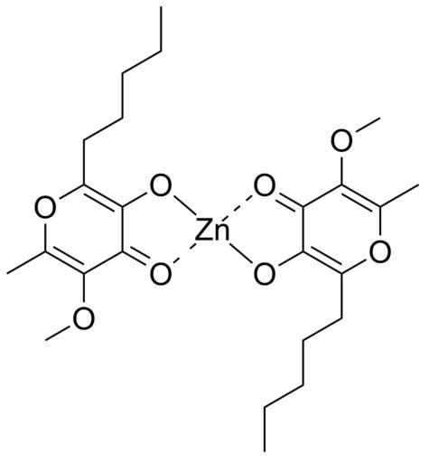 Keywords: Zn(alx)2.svg Chemical structure of bis allixinato zinc II a zinc complex with allixin Own 17 40 16 February 2011 UTC Ed Edgar181 Zinc complexes Pyrones