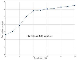 | Keywords: ZnBr2 Solubilité dans eau.png fr Solubilité du bromure de zinc dans l'eau en fonction de la température Créée par mes soins avec OpenOffice org Calc et The Gimp d'après http //www hbcpnetbase com/ Handbook of Chemistry Physics Epop Check categories 2009 May 1 fr wikipedia Bromure_de_zinc 1 Zinc bromide |