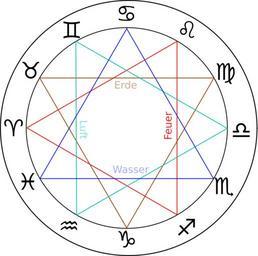 Keywords: ZodiacTrigonsDe.svg en Zodiac with element trigons red fire brown earth cyan air blue water and German lettering Sun moving clockwise Aries on the left own WolfgangRieger 2010-09-30 Zodiac aspects
