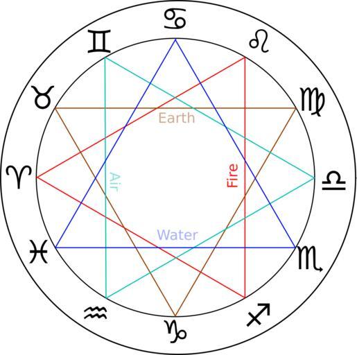 Keywords: ZodiacTrigonsEn.svg en Zodiac with element trigons red fire brown earth cyan air blue water and English lettering Sun moving clockwise Aries on the left own WolfgangRieger 2010-09-30 Zodiac aspects