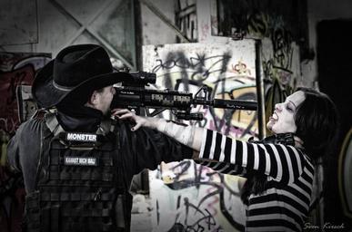 Keywords: zombie shot violent rifle kill defense undead monster horror woman female blood bloody