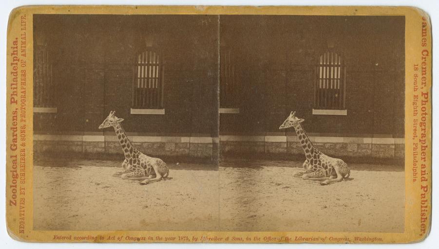 Keywords: stereographs philadelphia zoos zoological society zoologicalsociety zoological garden zoologicalgarden fairmount park fairmountpark giraffes animals james cremer jamescremer Shows a giraffe lying in a cage at the Zoological Garden in Fairmount Park, Philadelphia, 1875. A window covered in bars is visible on the wall behind the giraffe. Accession number: P.2011.47.1621 Shows a giraffe lying in a cage at the Zoological Garden in Fairmount Park, Philadelphia, 1875. A window covered in bars is visible on the wall behind the giraffe. Accession number: P.2011.47.1621 |