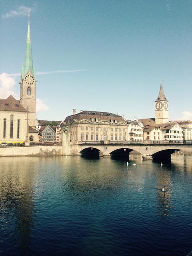 Keywords: zurich limmath river fraumünster st peter's church church sky switzerland