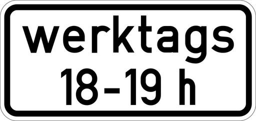 | View Original: | Zusatzzeichen 721 - werktags - zeitliche Beschränkung (zweizeilig).svg (965x456) | |||