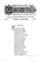 | Keywords: Zvon-st1.png Naslovna stran časnika Ljubljanski zvon NT9XWY52 1881-01-01 Creator Simon Gregorčič Besedilo Ljubljanski<br/> Zvon<br/> Leposloven in znanstven list <br/> Izdajatelji Jos Jurčič Janko Kersnik Fran Levec dr Ivan Tavčar ---- Leto I V Ljubljani 1 januvarja 1881 Štev 1 ---- Zvonu Prelit je zvon in prepelján <br/> S trakovi venci ves obdan <br/> Povsod lepó srčnó vzprijét<br/> Od mož mladeničev deklet;<br/> Z domače line še ta dan<br/> Bo glasno pel čez hrib in plan --<br/> O poj nam zvon le poj na glás <br/> Čez mesto dóni trg in vás <br/> Prijazno božaj nam uhó <br/> Ter v dušo sezaj nam krepkó <br/> Ti duh oživljaj povzdigúj <br/> Srcé nam blaži navdušúj <br/> Na delo čvrsto budi nas <br/> Pretéči znani nam požár<br/> Odganjaj divji nam vihar <br/> Življenje naše vse spremljáj <br/> Izráz dogodbam raznim daj <br/> Veselo srečnim dóni ti <br/> A tožnim tožno zvoni ti;<br/> Zdaj glas naj tvoj slovesen bo <br/> Zdaj mil naj zdaj naj resen bo;<br/> A vedno -- kakorkoli poj --<br/> Naj čist in polen glas bo tvoj X Simon Gregorčič 1 PD-old-100 Poems by Simon Gregorčič Signatures of poets Signatures of poets from Slovenia 1881 newspapers Ljubljanski zvon |