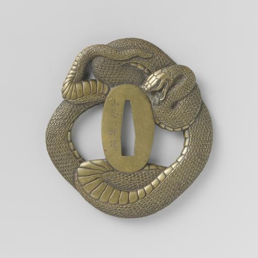 Keywords: Zwaardstootplaat-Rijksmuseum AK-MAK-1107.jpeg accession number AK-MAK-1107 anonymous; Hidekazu; Terakazu credit line GWToolset Rijksmuseum nl Tsuba in de vorm van een slang met opengesperde bek; tong en oog in roodkooper en zilver; gesigneerd ichiryuken hidekazu of ichiryuken terakazu Label Line possibly Hidekazu 1800 - 1900 messing Height cm 7 8 Width cm 7 2 exhibition history Institution Rijksmuseum brass ; nl roodkoper ; silver object history Acquisition 1972 object type PD-US PD-old Data and photography rights All data and all images made available through the API are either in the public domain or are subject to a CC0 license https //www rijksmuseum nl/en/api/terms-and-conditions-of-use cc-zero place of creation Japan http //www rijksmuseum nl/collectie/AK-MAK-1107 http //hdl handle net/10934/RM0001 COLLECT 1091 handle Zwaardstootplaat Uploaded with GWToolset Rijksmuseum AK-MAK-1107 http //www rijksmuseum nl/media/assets/AK-MAK-1107 Images uploaded by Fæ Art of Japan in the Rijksmuseum Images from the Rijksmuseum |