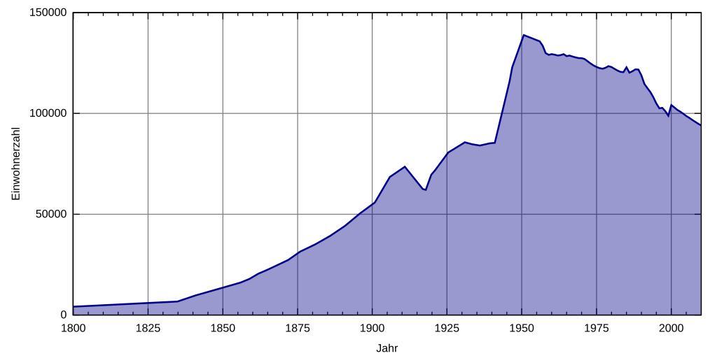 | Keywords: Zwickau population.svg en Zwickau population statistics since 1800 de Einwohnerentwicklung von Zwickau seit 1800 own ; data from de Einwohnerentwicklung_von_Zwickau Gorgo 2011-03-13 Gnuplot script to generate this plot gnuplot <source lang gnuplot > /usr/bin/gnuplot gnuplot 4 2 / Ubuntu 8 10 input set timefmt d m Y set datafile separator ; output unset key set style data lines set style fill transparent solid 0 4 set grid set xdata time set xlabel 'Jahr' set xrange '01 01 1800' '31 12 2009' set xtics 788400000 set mxtics 5 set format x ' Y' set ylabel 'Einwohnerzahl' set ytics 50000 set format y ' 0f' set term svg size 800 400 font Arial 10 set output 'zwickau_population svg' plot '-' using 1 2 with filledcurves below x1 lt rgb 'dark-blue' lw 2 30 06 1470;3500 30 06 1530;7700 30 06 1611;6300 30 06 1631;5400 30 06 1640;2983 30 06 1660;2866 30 06 1723;3753 30 06 1755;4151 30 06 1800;4189 01 12 1834;6701 01 12 1840;9740 03 12 1855;16052 03 12 1858;17878 03 12 1861;20492 03 12 1864;22400 03 12 1867;24509 01 12 1871;27322 01 12 1875;31490 01 12 1880;35005 01 12 1885;39243 01 12 1890;44198 02 12 1895;50391 01 12 1900;55825 01 12 1905;68502 01 12 1910;73542 01 12 1916;62482 05 12 1917;62095 08 10 1919;69600 31 12 1920;71753 16 06 1925;80664 31 12 1930;85685 16 06 1933;84701 31 12 1935;84059 17 05 1939;85198 31 12 1940;85400 01 12 1945;115780 29 10 1946;122862 31 08 1950;138844 31 12 1955;135751 31 12 1956;133580 31 12 1957;129953 31 12 1958;129069 31 12 1959;129394 31 12 1960;129138 31 12 1961;128723 31 12 1962;128935 31 12 1963;129389 31 12 1964;128431 31 12 1965;128678 31 12 1966;128184 31 12 1967;127795 31 12 1968;127459 31 12 1969;127395 31 12 1970;126988 31 12 1971;125892 31 12 1972;124796 31 12 1973;123830 31 12 1974;123069 31 12 1975;122496 31 12 1976;122168 31 12 1977;122640 31 12 1978;123446 31 12 1979;122988 31 12 1980;122129 31 12 1981;121283 31 12 1982;120605 31 12 1983;120486 31 12 1984;122886 31 12 1985;120206 31 12 1986;120923 31 12 1987;121870 31 12 1988;121749 31 12 1989;118914 31 12 1990;114632 31 12 1991;112565 31 12 1992;110583 31 12 1993;107988 31 12 1994;104921 31 12 1995;102563 31 12 1996;102752 31 12 1997;101130 31 12 1998;98840 31 12 1999;104146 31 12 2000;103008 31 12 2001;101726 31 12 2002;100892 31 12 2003;99846 31 12 2004;98742 31 12 2005;97832 31 12 2006;96786 31 12 2007;95841 31 12 2008;94887 31 12 2009;94029 e </source> Cc-zero Temporal population graphs of Saxony Zwickau Images with Gnuplot source code |