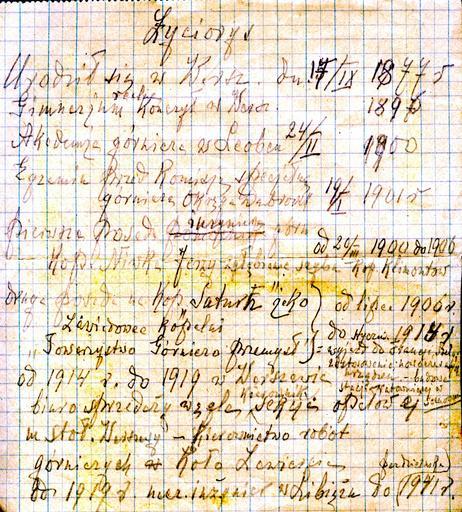 | Keywords: Zygmunt Szczotkowski-zyciorys.jpg pl Brudnopis życiorysu Zygmunta Szczotkowskiego sporzÄ…dzony rÄ™kÄ… wdowy po nim Marii own Julo ca 1944 PD-heirs float 1 width 50 style background-color inherit;border-collapse collapse;border-style none;margin 5em 75em; 20 valign top style color B2B7F2;font-size 40px;font-family 'Times New Roman' serif;font-weight bold;text-align left;padding 2 2px;padding-top 4px top align left style padding 0 10px; <big>Å»yciorys</big> UrodziÅ‚ siÄ™ w Warsz dn 17/IX 1877 r Gimnazjum realne koÅ„czyÅ‚ w Warsz 1896 AkademjÄ™ górniczÄ… w Leoben 24/II 1900 Egzamin przed KomisjÄ… specjalnÄ… górniczÄ… okrÄ™gu DÄ…browsk 19/I 1901 r Pierwsza posada inżyniera górn od 20/III 1900 do 1906 Kop Niwka “Jerzy zgłębianie szybu Kop Klimontów druga posada na Kop žSaturn jako od lipca 1906 r zawiadowca kopalni do stycznia 1914 r žTowarzystwa Górniczo przemysÅ‚ z wyjazdem do Francji Belgii zastosowanie nowoczesnych urzÄ…dzeÅ„ “ budowa stacji ratowniczej w Sosnowcu od 1914 r do 1919 w Warszawie biuro sprzedaży wÄ™gla “ kierownik sekcji opaÅ‚owej m StoÅ‚ Warszawy “ kierownictwo robót górniczych koÅ‚o Zawiercia od 1919 r <ref name błąd /> nacz inżynier w Libiążu do października 1941 r <ref name błąd >tu błędy merytoryczne; w rzeczywistoÅ›ci w Libiążu pracowaÅ‚ od 1 III 1920 do wrzeÅ›nia 1940</ref> 20 valign bottom style color B2B7F2;font-size 40px;font-family 'Times New Roman' serif;font-weight bold;text-align right;padding 2 2px;padding 4px; - 3 style padding-top 10px OryginaÅ‚ napisany ołówkiem na kartce z notatnika ---- <references /> Zygmunt Szczotkowski |